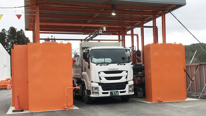 従来、放射性物質を含む除去土壌などの放射能濃度の判定を行うために、大型土のう袋に入った除去土壌を1袋ずつ測定していました。そこで大林組は、迅速かつ高精度に測定・記録できる「TRUCKSCAN(トラックスキャン)」を開発しました。
