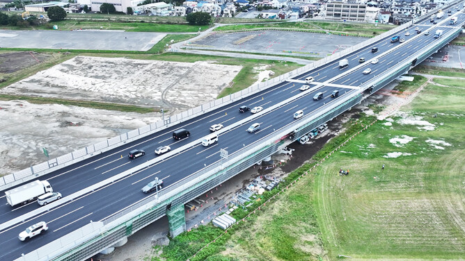東名多摩川橋は、東名高速道路の多摩川にかかる、交通量が1日当たり約10万台に上る橋です。その床版取り替え工事では渋滞の回避による社会的影響の最小化が求められましたが、車線数維持のために通常行う路肩の拡幅は、近隣の用地制約により困難でした。