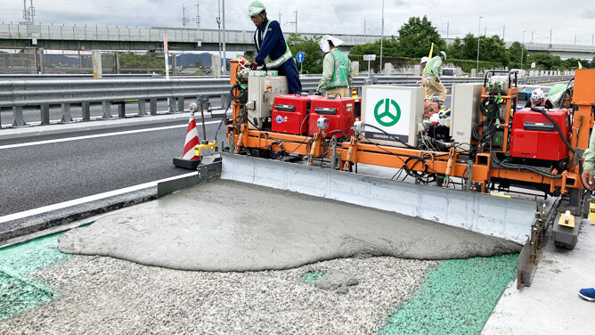 高速道路における既設床版の疲労耐久性の向上や再劣化防止を目的とする床版上面増厚工法の材料として、超速硬型UHPFRC「スティフクリート」を開発しました。この材料は、道路勾配に対応して早期に交通開放が可能で、車載型プラントおよび運搬・敷きならし機械を用いることで、1車線規制内で製造から敷きならしまでの工程を完結できます。