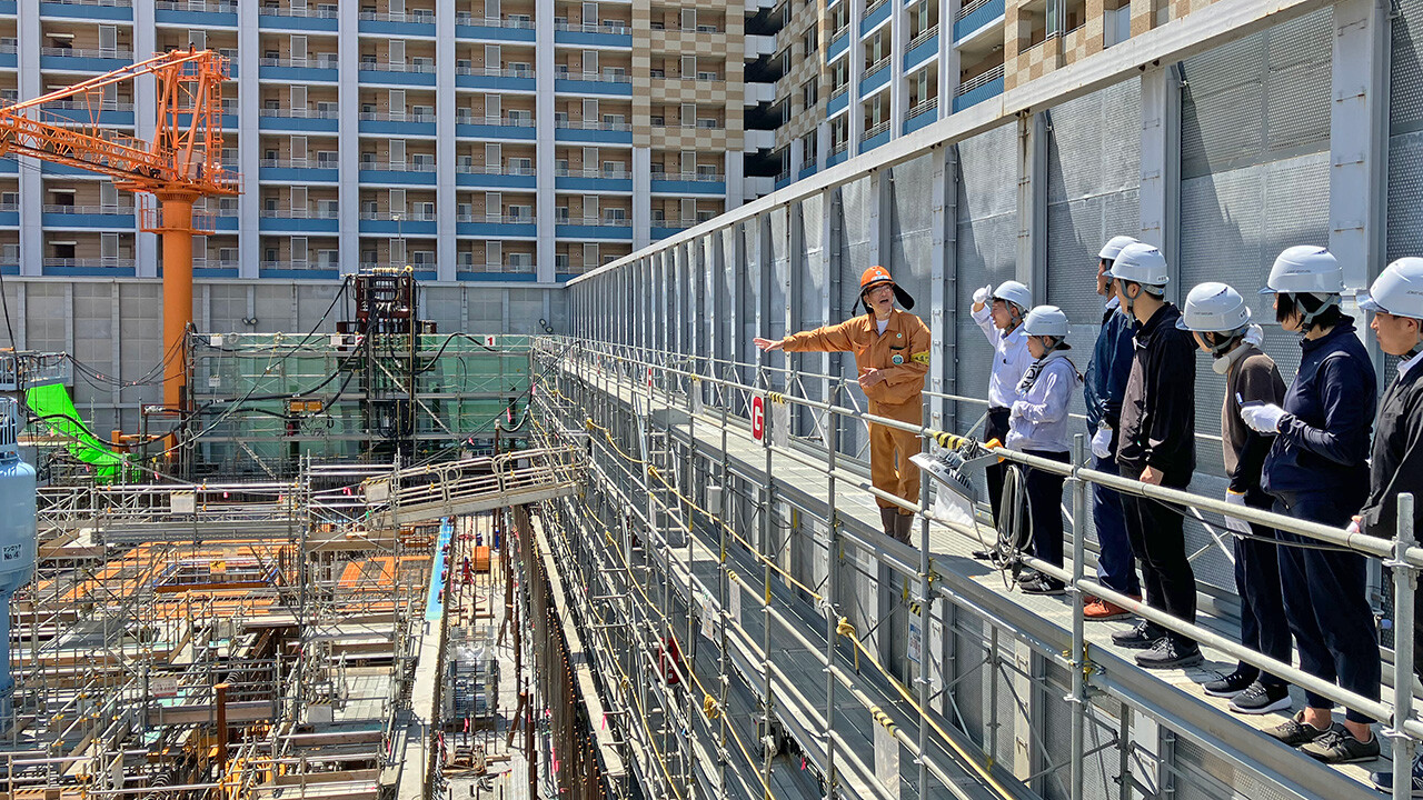 2日目は、勝どきポンプ所(東京都中央区)のポンプ棟建設工事の見学会を実施しました。足場の上からポンプ棟設備を説明し、モニター画面で掘削機を遠隔操作している掘削管理室を見学してもらいました。見学後、先生方から現場職員に対して多くの質問があがりました。