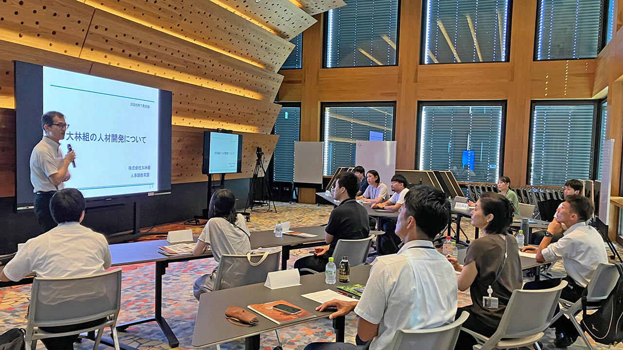 続くPort Plus 大林組横浜研修所では、木の特性を生かしたウェルネス空間を体感してもらい、人事部による研修では、大林組の教育プログラムや人材育成の取り組みなどを紹介。グループワークも行い、活発な意見交換を行いました。