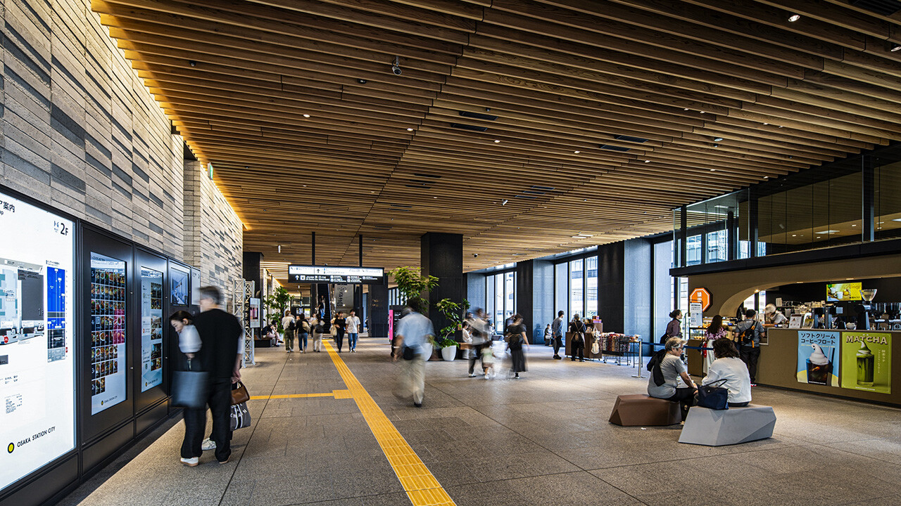 都市計画により交通広場として街をつなぐ2階歩行者通路「彩の路」。表情豊かな大型コンクリートブロックの組積壁や天然木のルーバー天井、行き交う人々の活動を映す鏡面天井により、大阪駅開業150年の変遷を継ぎ、利用者の思いや記憶を留め、永く時を刻む駅ビルとなることを目指した(©株式会社 伸和)