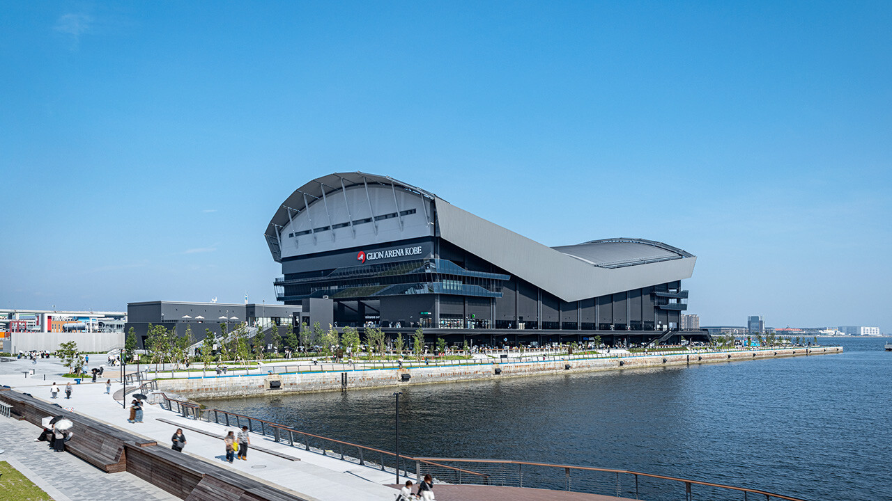 GLION ARENA KOBE(ジーライオンアリーナ神戸)は、兵庫県神戸市の国際貿易港として栄えたウォーターフロントに誕生した次世代アリーナです。瀬戸内海と六甲山地に向かって広がる印象的なV字型のシルエットにより、エリアのランドマークとしてにぎわいの拠点となっています。
