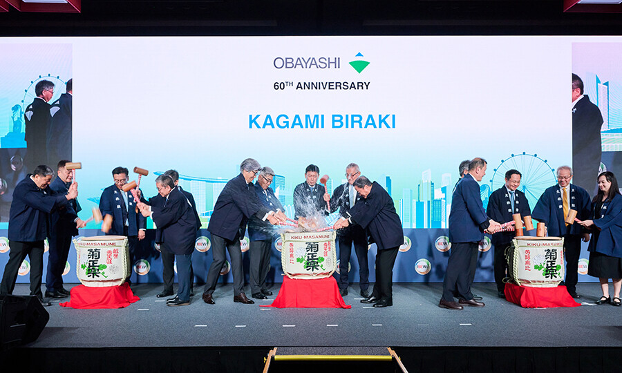 鏡開きを行う大林組および大林シンガポールの役員はじめ関係者ら