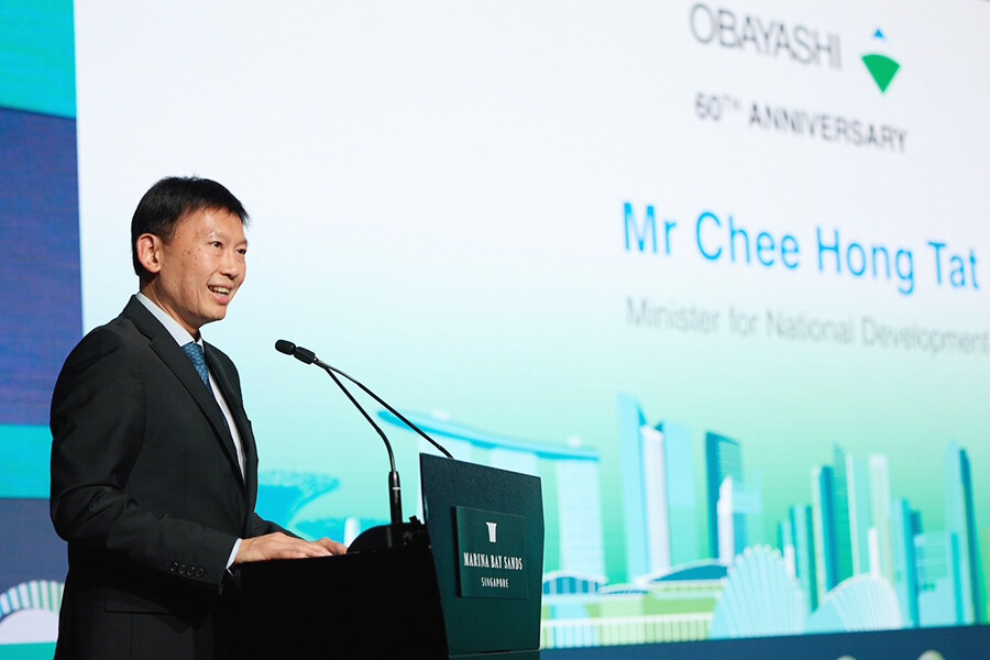 チー・ホン・タット大臣も登壇し、「シンガポールもまた、建国60周年という節目を迎えました。この共通の記念の年は、大林組の歩みが、シンガポールの国家建設の歴史と深く連動していることを改めて思い起こさせるものです。1965年、シンガポールは発展途上の国でしたが、貴社は当地に投資を行い、オフィスを開設されました。シンガポールがマレーシアから分離した年に、貴社は私たちに投資し、信任の一票を投じてくれたのです。