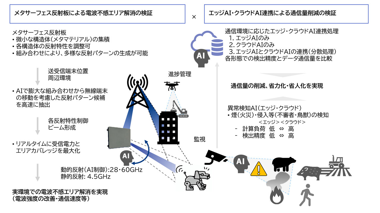 メタサーフェス反射板を用いた通信環境の安定確立およびエッジ・クラウドAI連携による通信負荷軽減を実現し、AI・ロボット活用による業務省力化・省人化を目指す