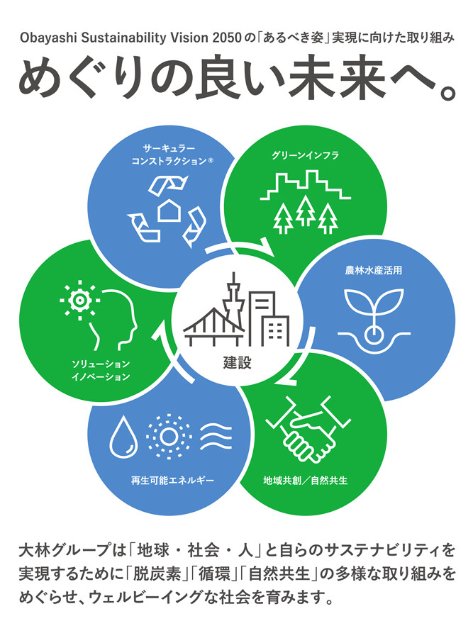 大林グループは、長期ビジョン「Obayashi Sustainability Vision 2050」を策定し、「地球・社会・人」と自らのサステナビリティを実現するために多様な環境の取り組みを進めています。