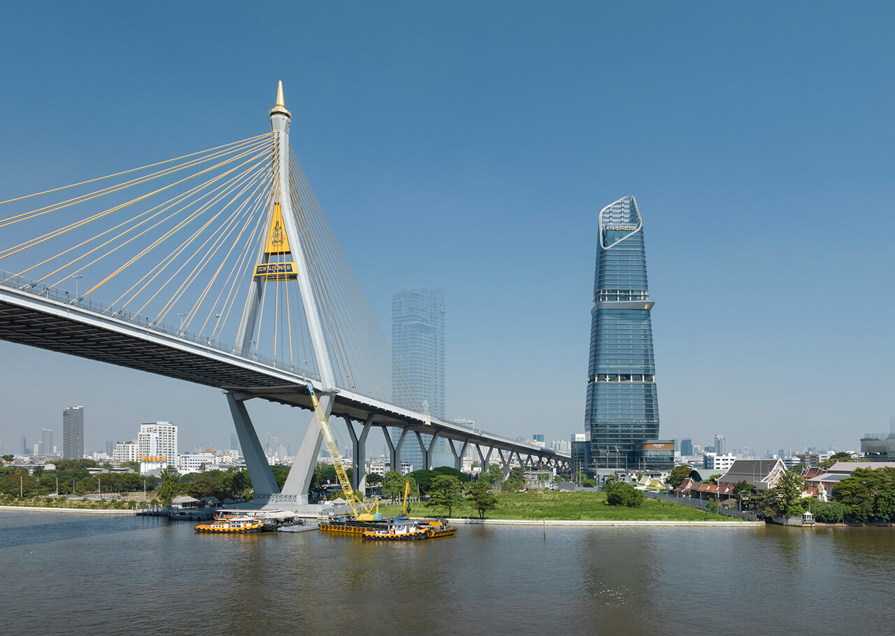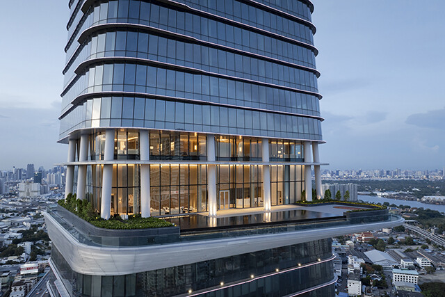 タイの大手企業グループ・サハグループが開発した、高さ255m、地上53階の高層オフィスビルです。チャオプラヤー川沿いに建つこのビルは、隣接するプミポン橋の主塔のシルエットを外観デザインに取り入れたことで、地域の景観と調和しながらランドマーク性を高めています。LEED認証やFitwel(※1)3つ星などの国際環境認証を取得し、快適性や省エネへの配慮を両立しました。