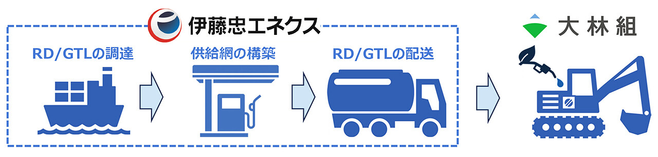 株式会社大林組(本社:東京都港区、代表取締役社長 兼 CEO:佐藤俊美)と伊藤忠エネクス株式会社(本社:東京都千代田区、代表取締役社長:田畑信幸)は、温室効果ガスの直接排出削減に向け、大林組の建設現場で稼働する建設機械を対象に、次世代バイオ燃料「リニューアブルディーゼル(RD)(※1)」および合成燃料「GTL燃料(※2)」などの軽油代替燃料の利用を推進します。
