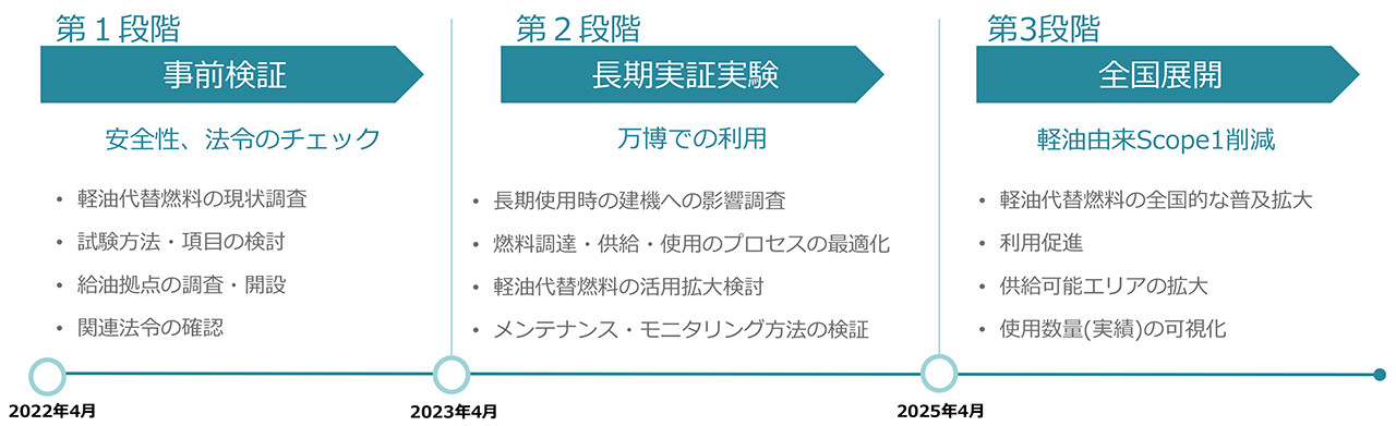 両社は、2022年から軽油代替燃料の利用検討に着手し、2023年に大阪・関西万博の建設工事(※3)でRDを利用するなど、建設現場における軽油代替燃料の試行利用を重ねてきました。これまでの検証結果を踏まえ、現在は建設現場への本格利用に取り組んでいます。