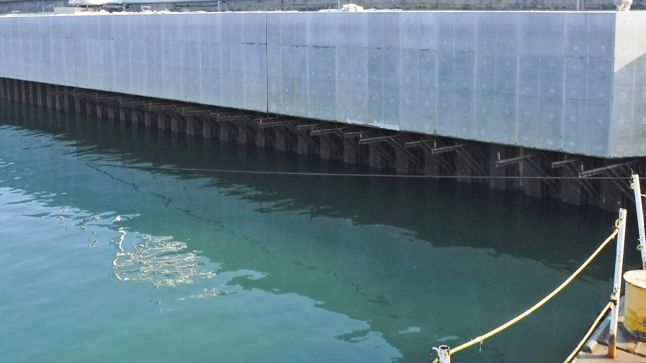 薄い板状素材の「スムースボード」で構造物を覆い、コンクリート表面を保護する工法です。ボード裏の凹凸による高い付着力があり、有害な物質の浸入を防いで構造物を長寿命化します。また、切断・削孔が容易なことから、あらゆる形状に加工できます。