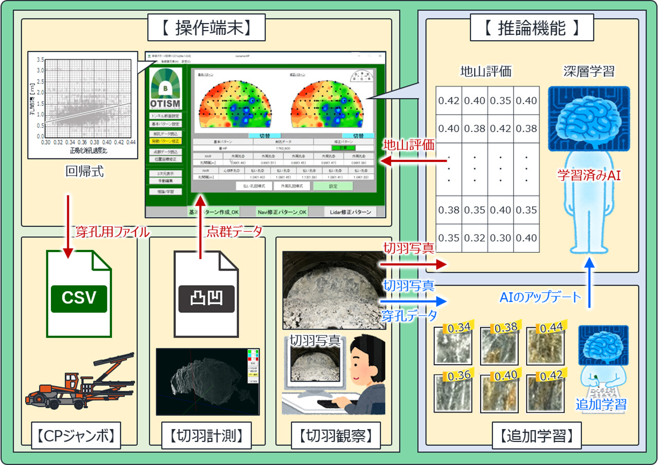 - 掘削する切羽の写真を使用してAIによる地山評価を実施。AIは学習済みの切羽の写真と穿孔データだけではなく、適用した現場で取得した切羽写真と穿孔データを教師データとして随時追加学習を行う。