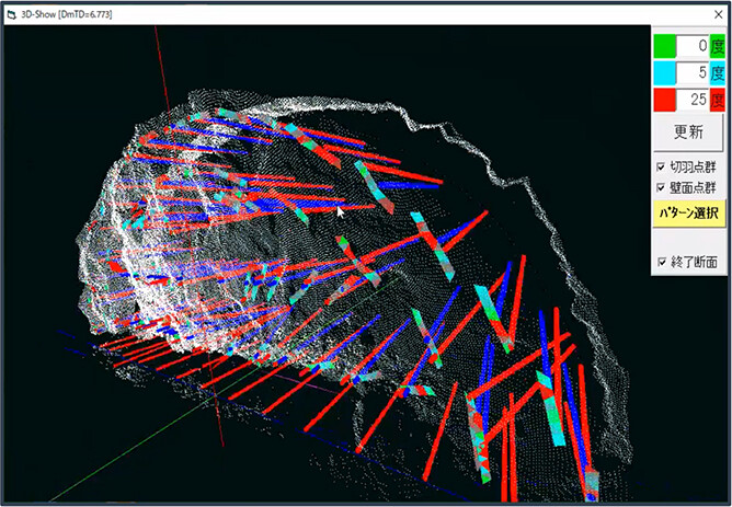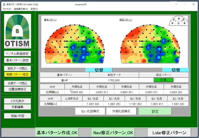 - AIによる地山評価結果をもとに、地山硬軟と発破孔数の関係式である回帰式によって発破パターンが作成される。回帰式は大林組保有の熟練技能者の発破実績のビッグデータの分析結果に基づいている。また、切羽形状の計測結果に基づき、最適な外周孔角度と穿孔開始位置に座標修正する。