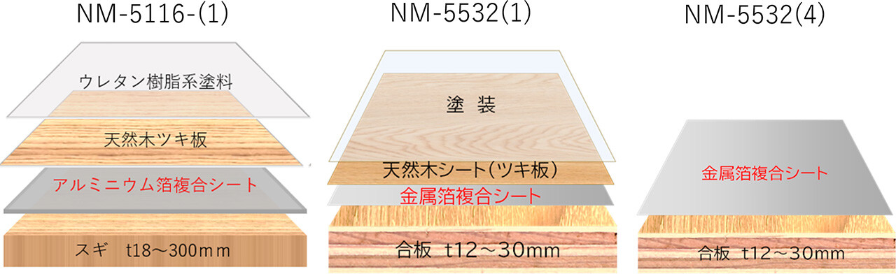 - 従来の不燃合板とは異なり、難燃剤の注入や長時間の乾燥工程を必要としないため、製造時のエネルギー消費量を削減でき、環境負荷を低減できます。加えて、解体時には表面のアルミニウム箔複合シートを剥がすことで木材のリサイクルが可能であり、森林資源の循環利用に寄与します。