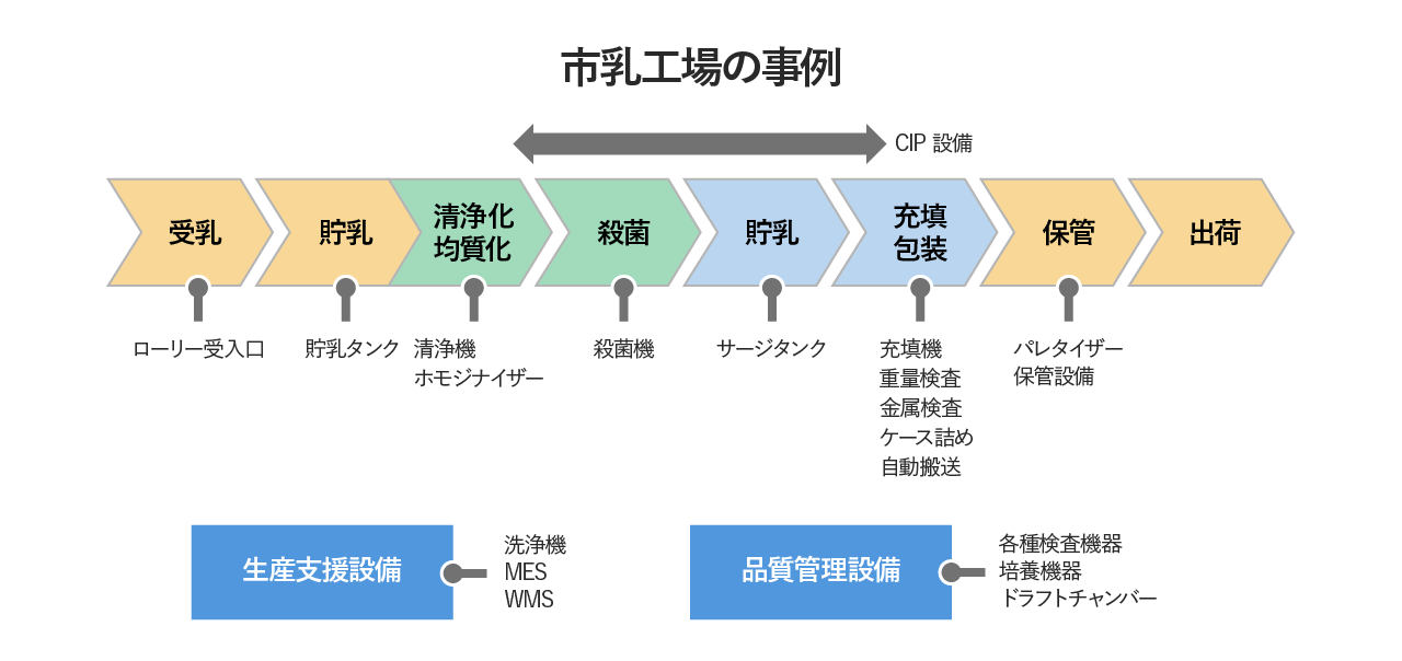 市乳/アイスクリームの製造施設は、原料保管から製品保管まで、配管やコンベアなどで生産設備が連続していることが大きな特徴です。原料を保管するための屋外サイロや貯蔵設備が大型であること、保管室が冷蔵冷凍環境であることへの配慮も必要です。