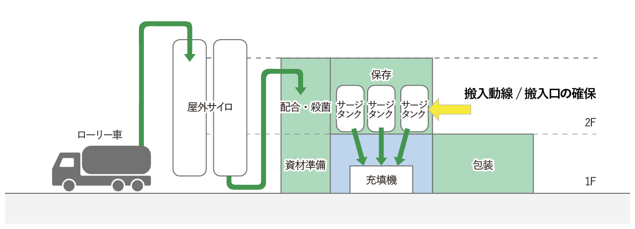 サージタンクは、中間製品をグラビティで充填(てん)機に送ることができる位置に設けます。将来のタンク交換に配慮した搬入動線や搬入口、屋内でのタンクたて起こしスペースも確保します。