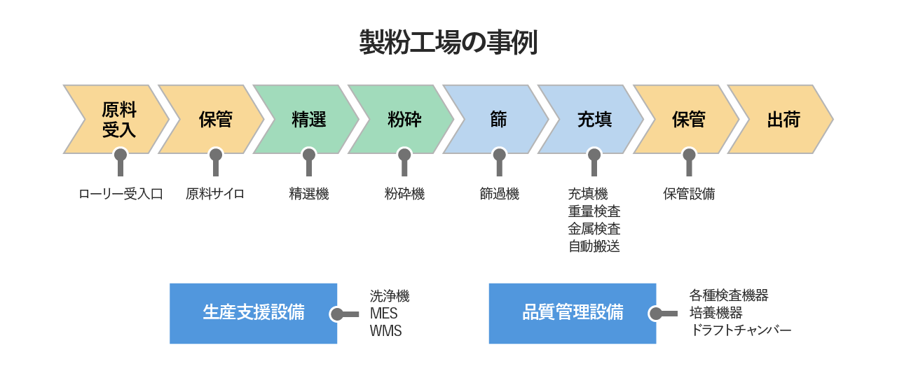 製粉/調味料の製造施設は、原料保管から製品保管まで、配管やコンベアなどで生産設備が連続していることが大きな特徴です。粉体をふるう際の振動と音の発生や、調合設備から充填(てん)用タンクまでグラビティ移送が採用されることが多い点にも留意が必要です。