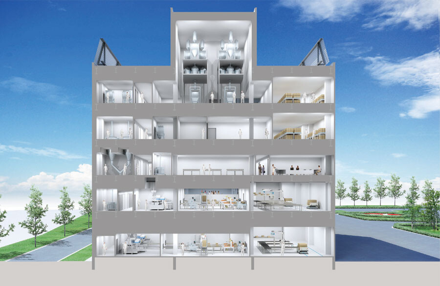 施設の計画においては、連続した生産ラインやサイロに代表される縦長の大型設備などの機器配置と施設計画を同時に行うとともに、振動対策や吹抜の計画など生産設備に配慮した構造計画により、効率的な製造施設をめざします。