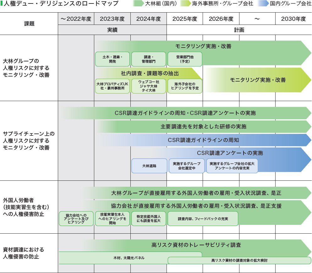 2011年度の人権方針策定からこれまで、人権デュー・デリジェンスの各種取り組みや体制整備を進めてきており、2022年度にはグループ全体で中期的に進めるロードマップを策定しました。このロードマップに沿って、主要事業部への人権リスクに対するモニタリングや大林組で実施している取り組みのグループ会社への展開などを実施しています。今後も策定したロードマップに基づき、人権尊重の取り組みを進めていきます。