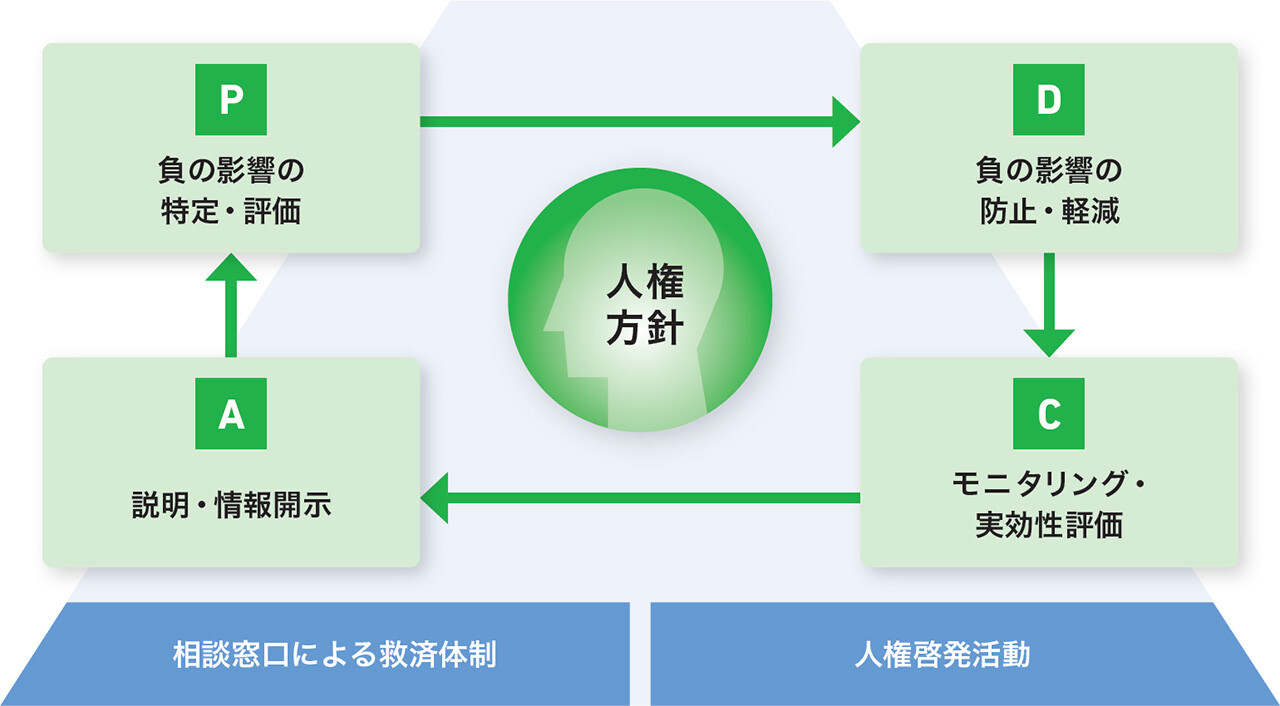 大林グループは、国連「ビジネスと人権に関する指導原則」に基づき、人権に対する負の影響の特定・評価、防止・軽減、モニタリング・実効性評価、説明・情報開示のPDCAサイクルを回しています。