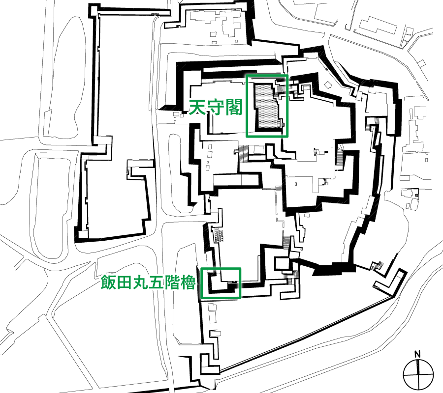 熊本城の敷地内で最も高いところに建つ天守閣。「大天守」と「小天守」から構成され、石垣を含む地盤面以下は国の特別史跡に指定されています。