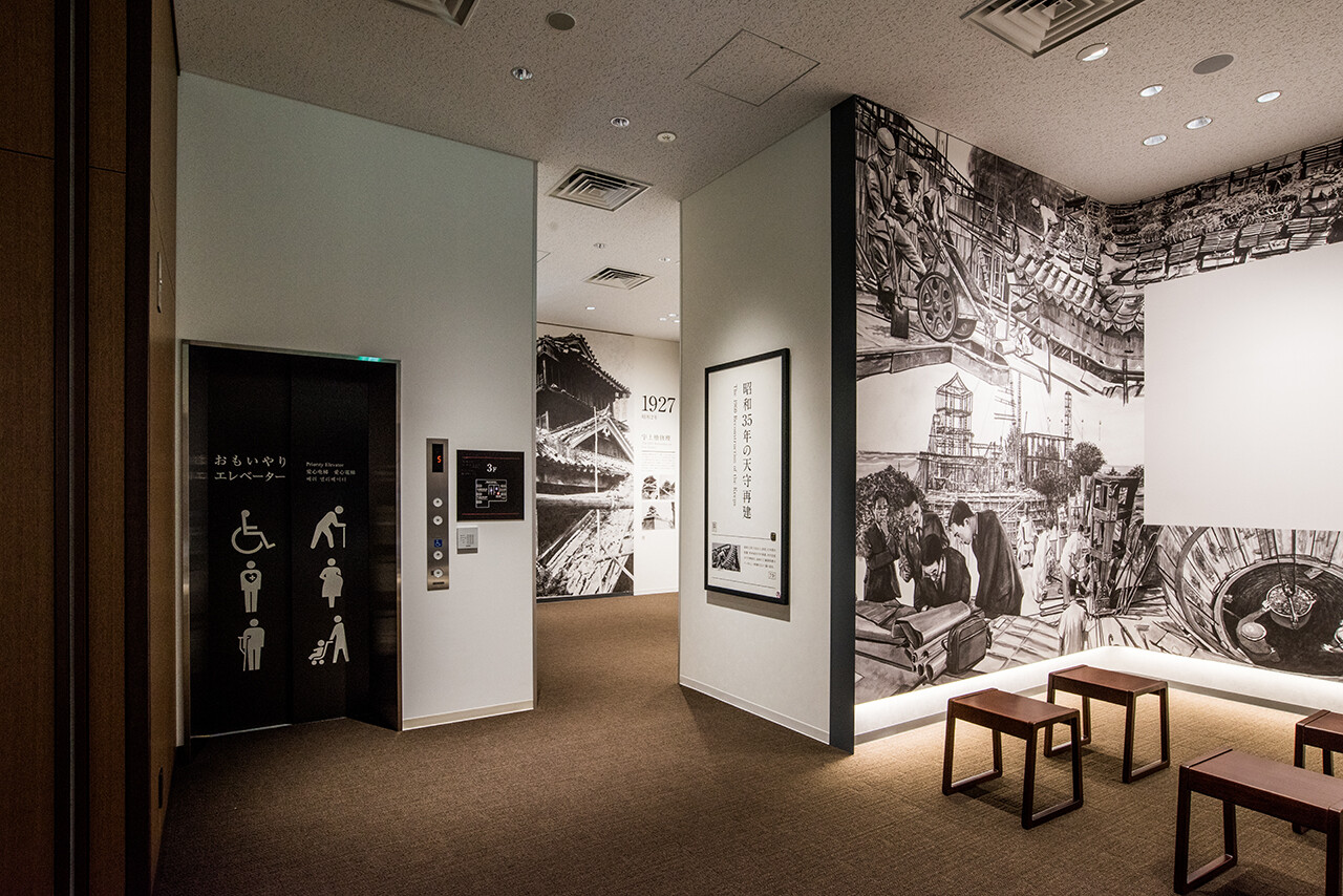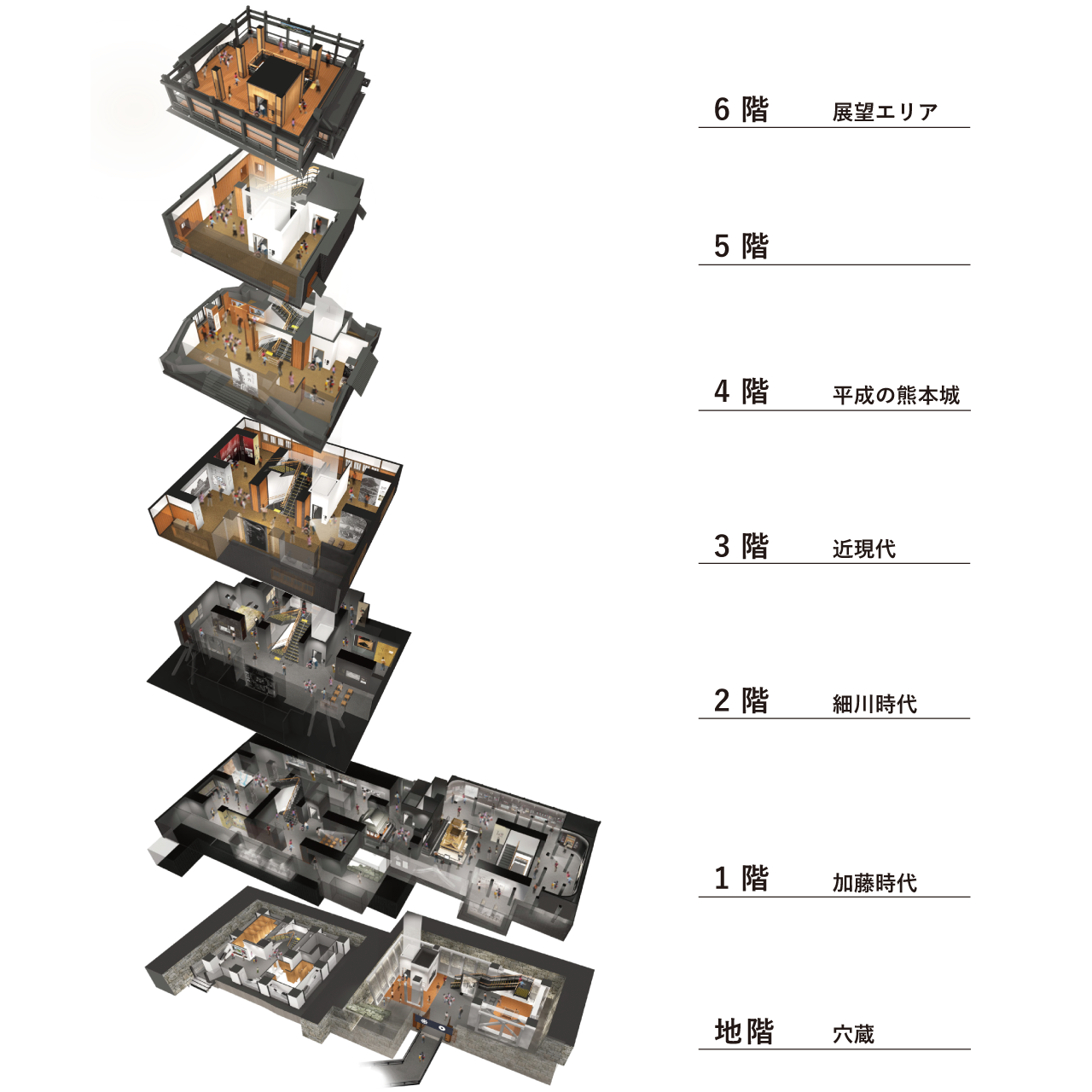 城内展示では、加藤清正によって建てられた熊本城天守が歴史の荒波の中で天災や焼失、再建といった出来事を経て、熊本のシンボルとして人びとの思いとともに現代にまで受け継がれてきたストーリーをデザインした