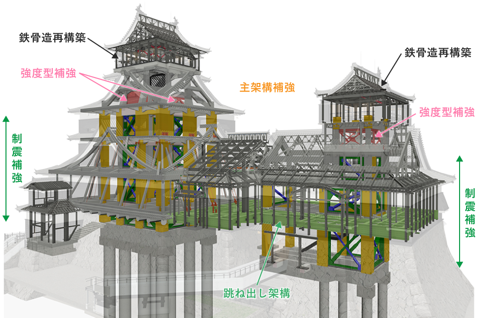 地震による損傷が大きかった最上階は鉄骨を用いて新たに構築し、階高3m程度の中間階は、3Q-Brace(サンキューブレース)や3Q-Wall(サンキューウォール)などの技術によって強度指向型補強を施すなど、高さや場所ごとに最適な工法を採用しました。