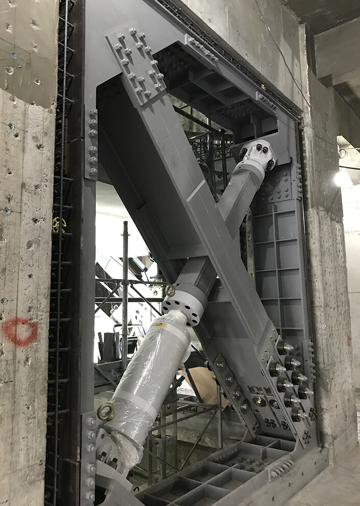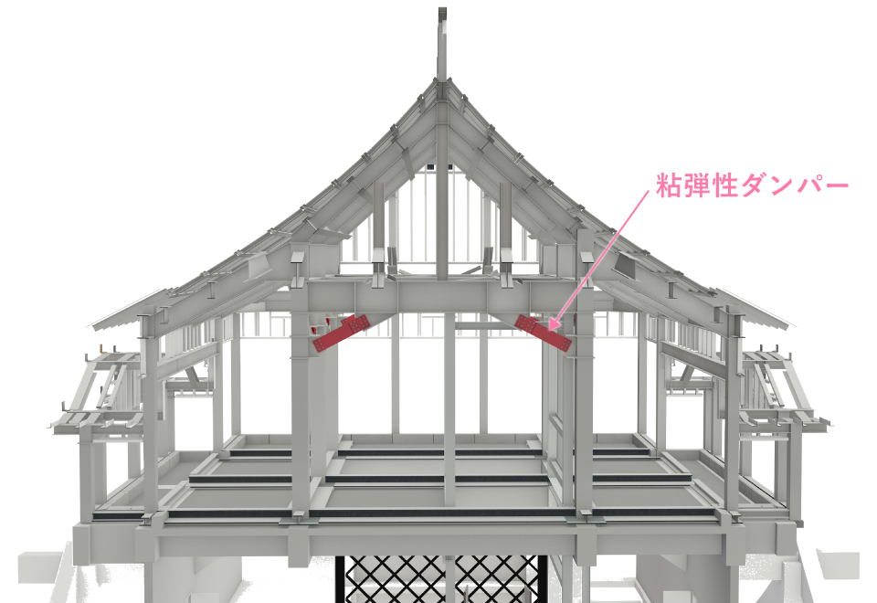 また、展示施設となっている内部の回遊性を確保しながら高い耐震性能を得るために、最小限の面積で設置できるクロスダンパーを開発しました。