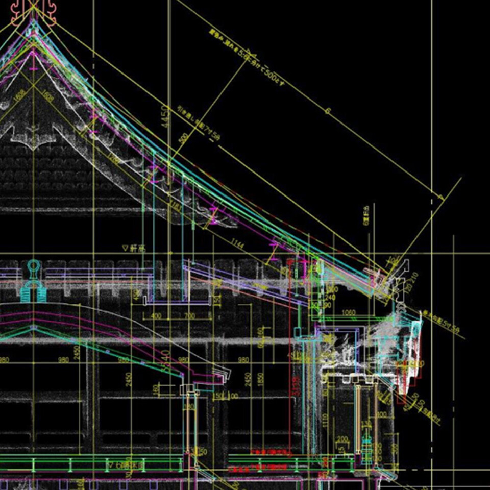 天守閣の復元にあたっては、3D測量した外観・内観の点群データを積極的に活用。大天守を忠実に復元するために、古図面から作成した断面詳細図と点群データを基にした設計図を重ね合わせて検討し、1960年当時の姿通りの復元ができているかを確認しました。