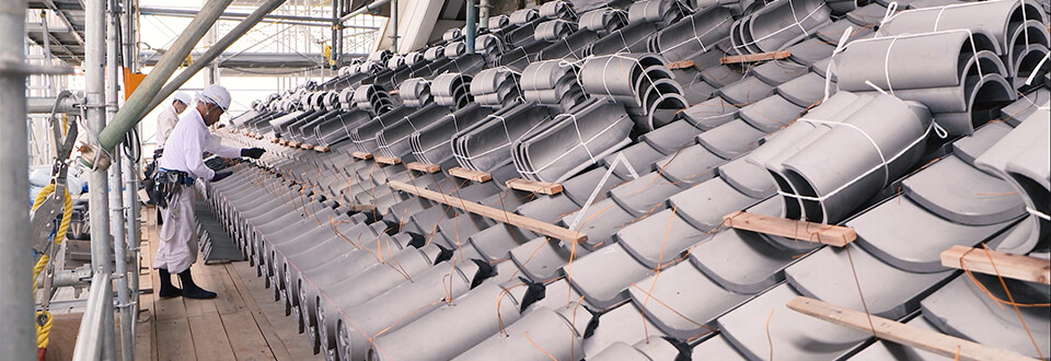 震災によって多くの瓦が損傷していたため、一つひとつ瓦を確認して再利用できるものを選定し、不足分は軽量化した土瓦を新たに用意し、組み合わせて使用しました。震災以前の資料を多数収集して外観再現に役立てるとともに、城郭構造に詳しい特別史跡熊本城跡保存活用委員会の意見も取り入れながら復元を進めていきました。