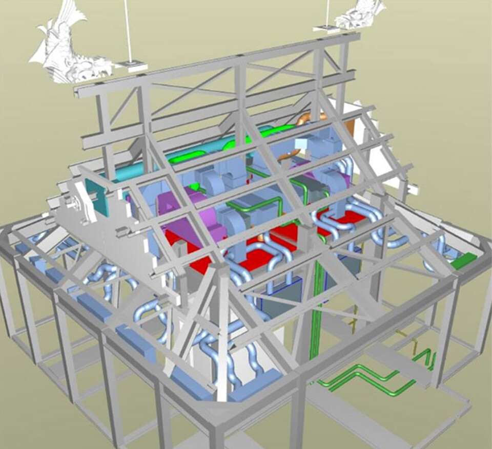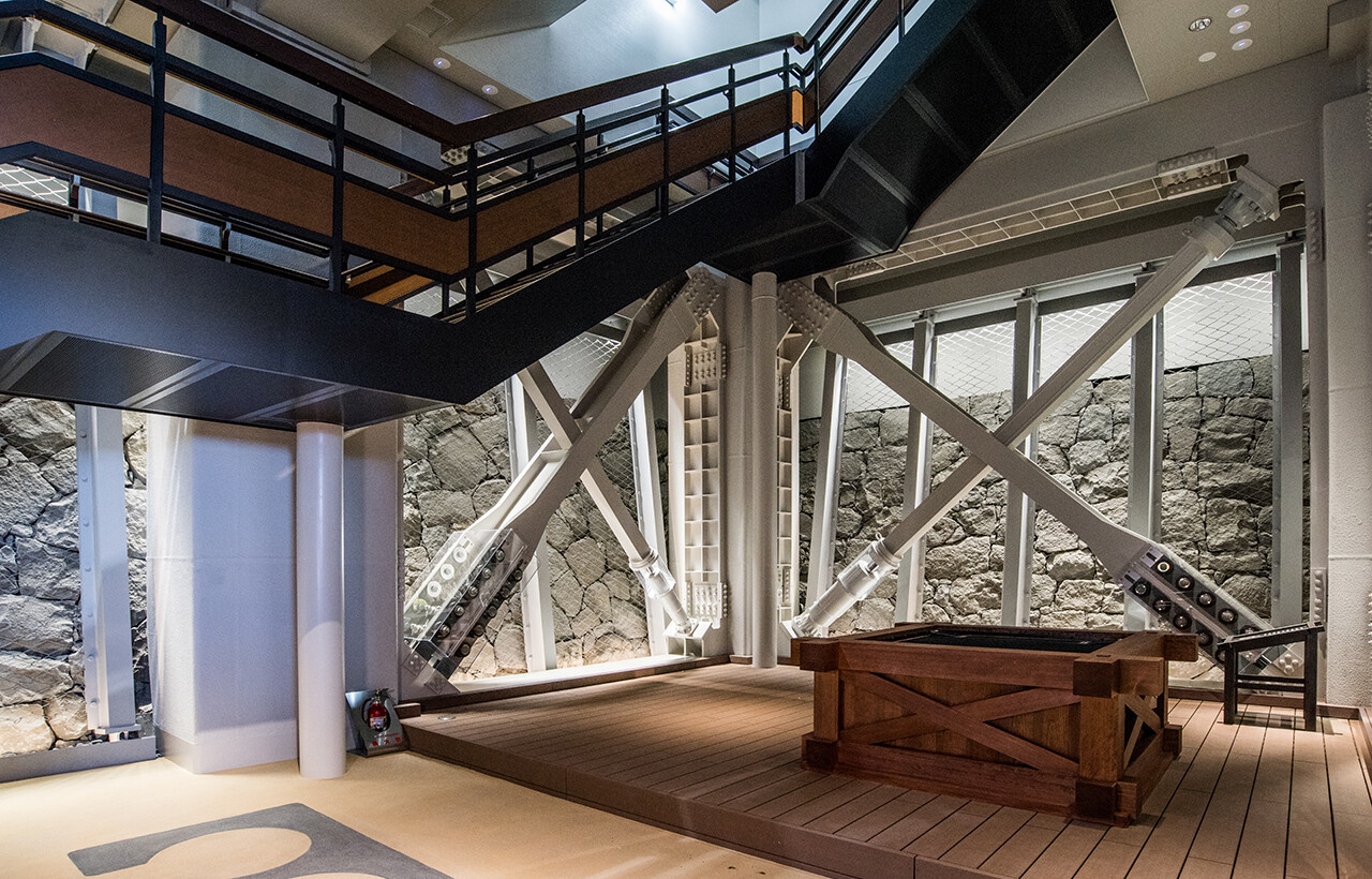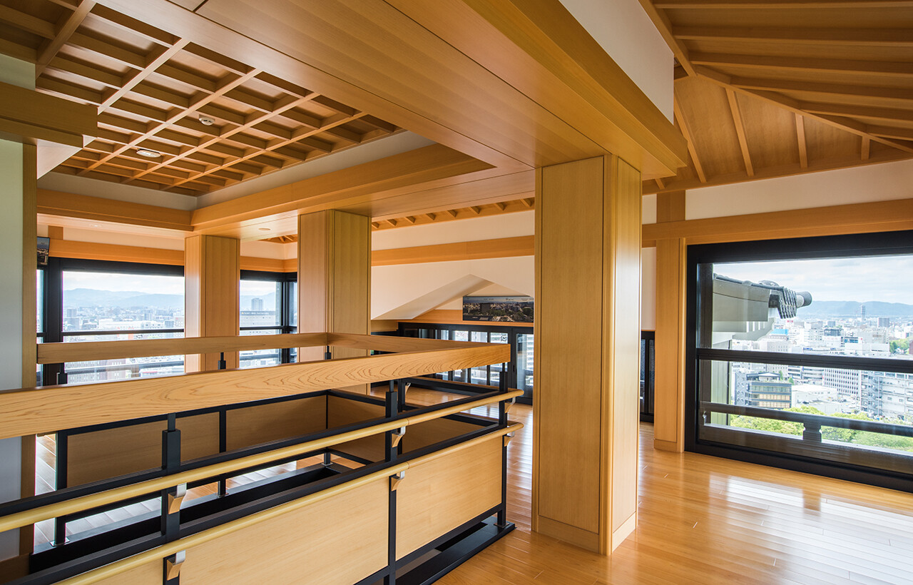 また、ダクトや配管、設備機器類を天守上部のコンパクトな機械室とシャフトに集約したことで、展示スペースを最大限確保しました。開館時間内にメンテナンス作業が生じた場合にも、利用者の移動や鑑賞を妨げることなく対応可能となり、展示施設としての機能向上を実現しました。