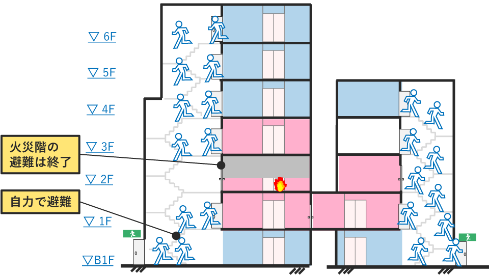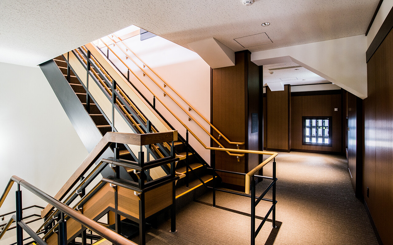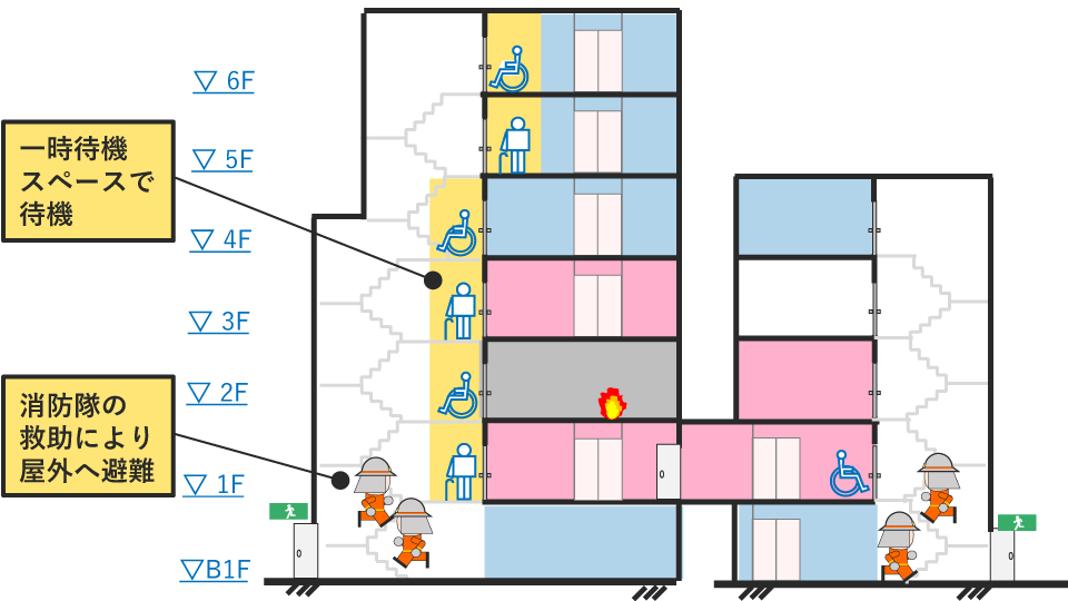 また、火災発生時に利用者が安全に屋外へ避難できるよう、階段部に防火シャッターを設置し、車いす利用者や高齢者などの要支援者の避難待機スペースを確保しました。要支援者は階段室に一時避難・待機し、消防隊が駆け付けるまでに健常者は階段にて避難完了。到着した消防隊が待機中の要支援者を救出するという避難シミュレーションを行い、火災時の安全性を飛躍的に向上させました。