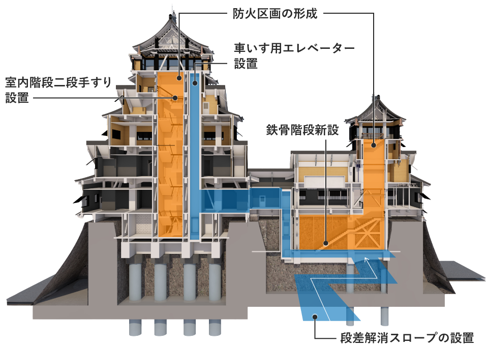 復元に合わせて、バリアフリー動線も新たに設けました。スロープや車いす用エレベーターなどを新設しています。