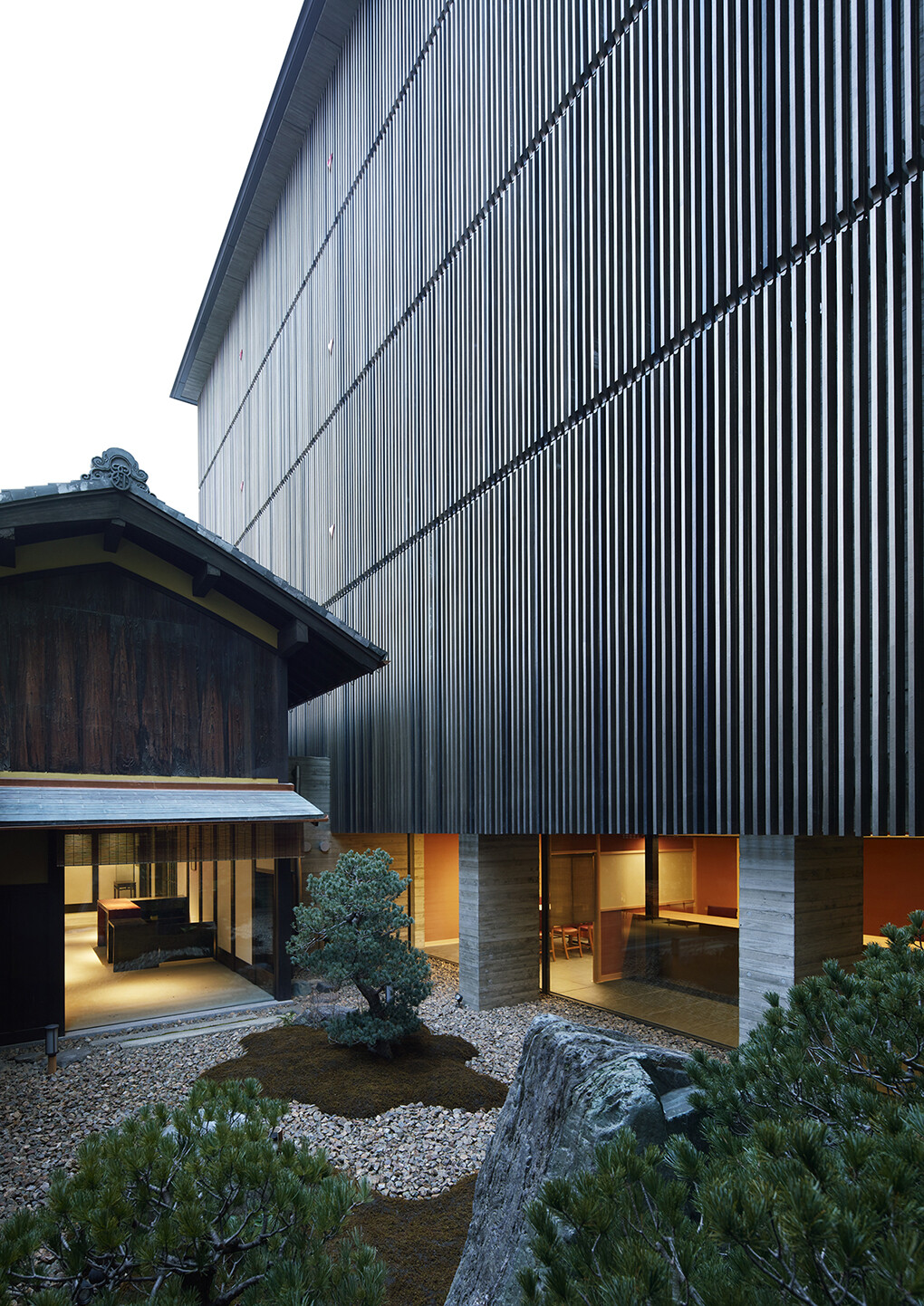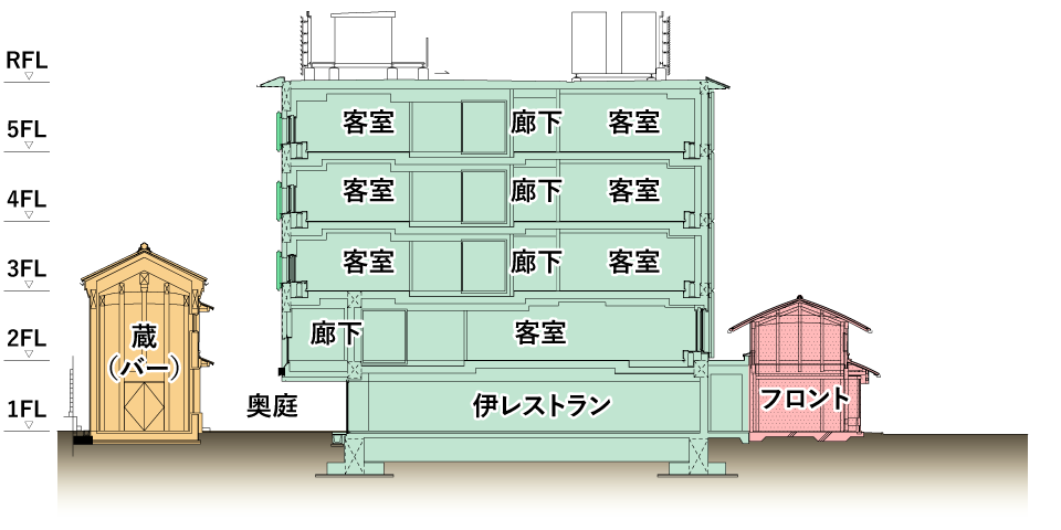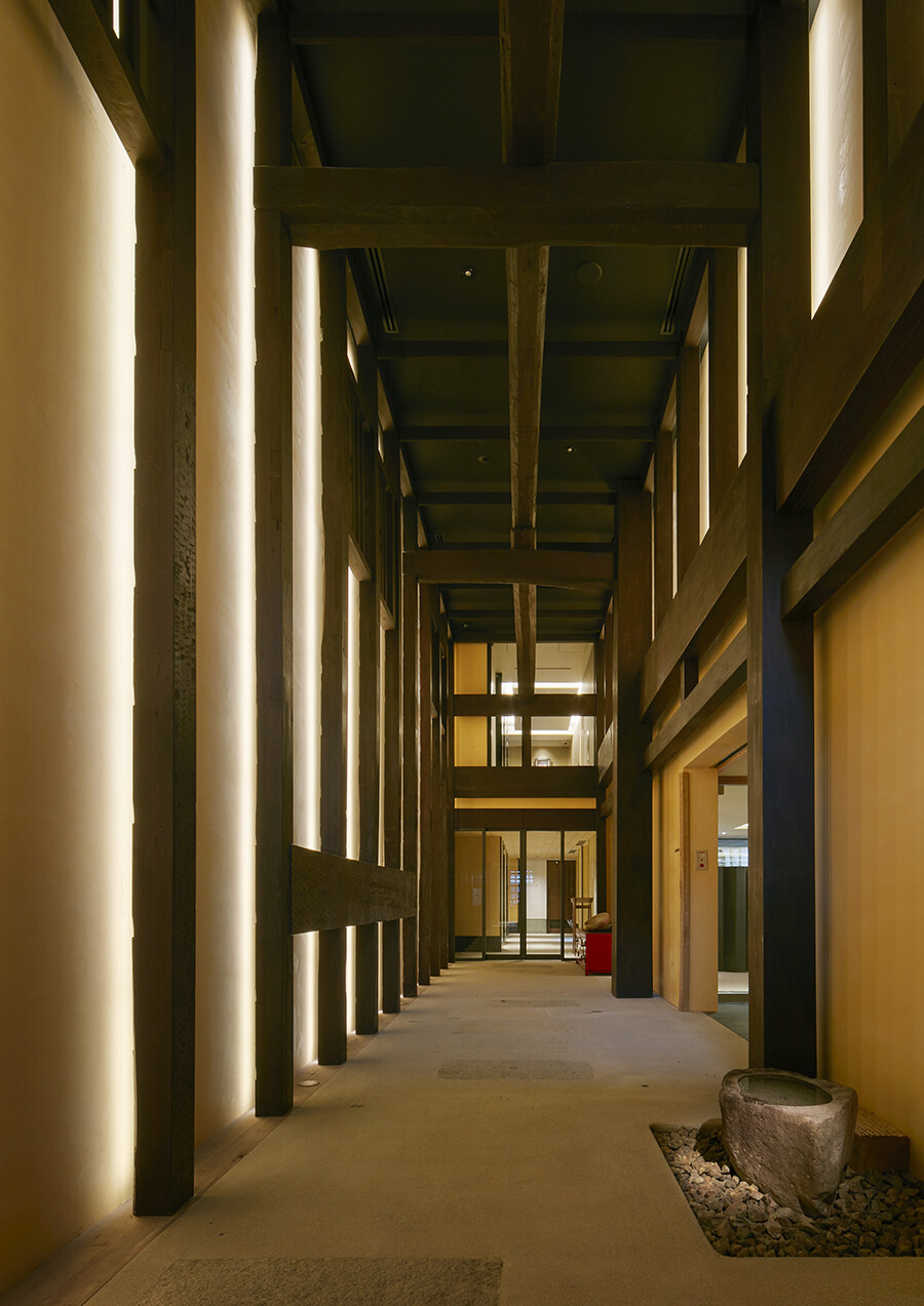 保存した伝統的な京町家の表家を主とし、新築した高層部は従として、京町家の背景となるように設えました。そうすることで、まるでこの建物がずっと以前からここにあったかのような存在感と京の町の空気感を残しながら、それでいて新しい雰囲気を創出しました。