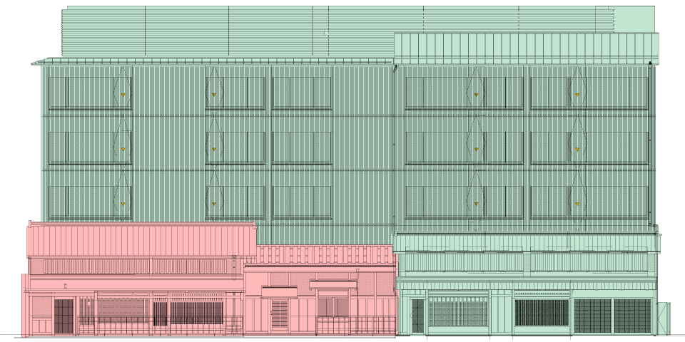 室町通りに面する表屋と高塀は構造補強して現況を保存し、その他の部分はそれに倣う形でファサードを構成し、間口約33mの町家のたたずまいをつくり出しました。