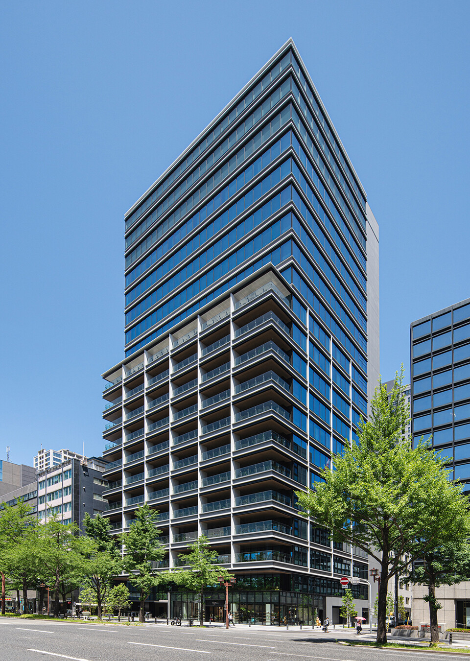 御堂筋に面した南西面外観。2階~12階の低層部はテラスを中心に構成した