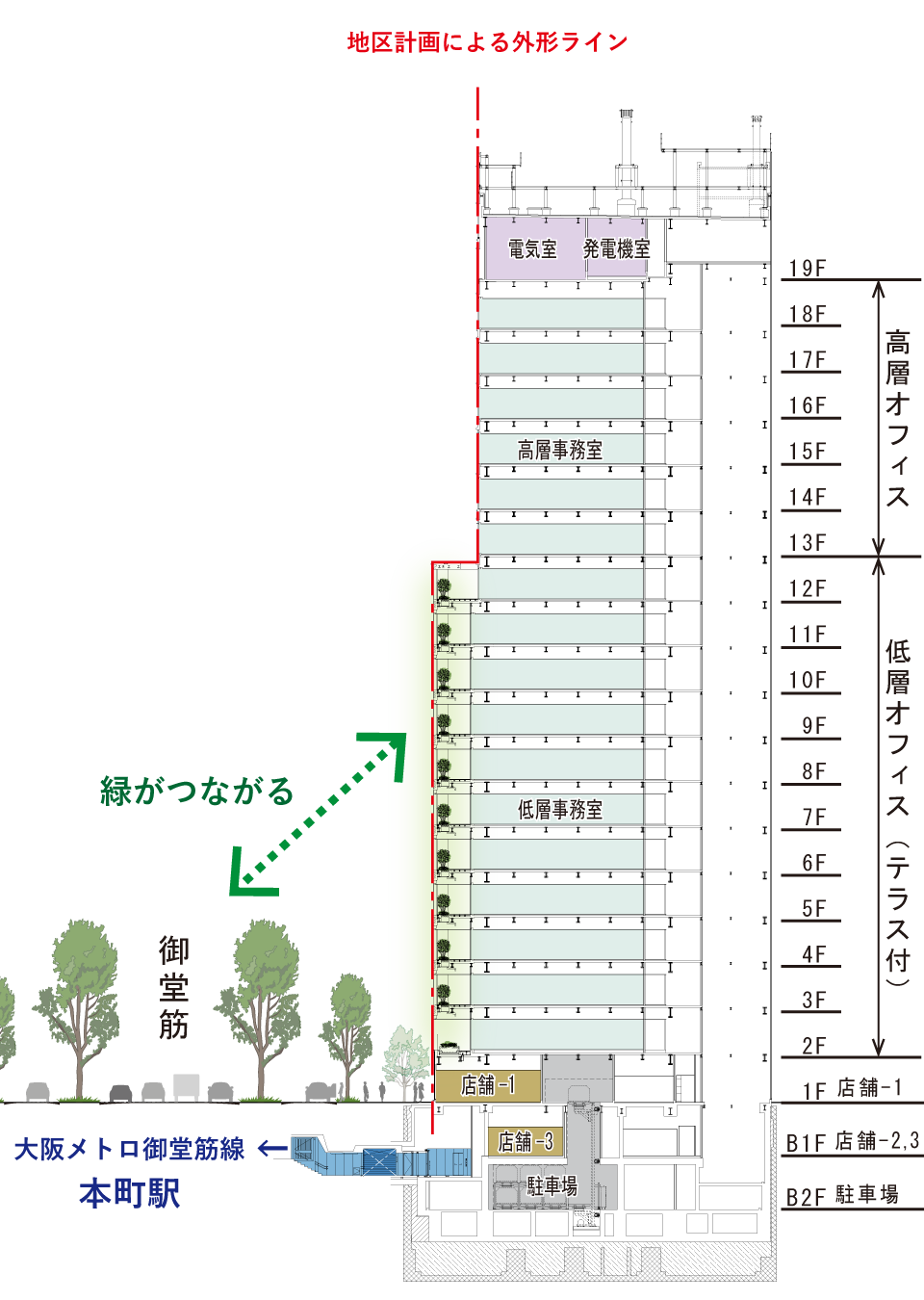 断面構成。地区計画によって定められた壁面の外形ライン(※1)を生かし、御堂筋の緑につなげるようにテラスを配置した
