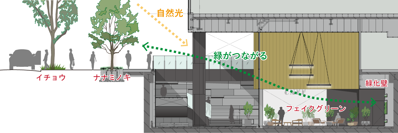 地上のイチョウ並木から地下へと、緑と光が連続するように計画しました。エントランスと一体化した半屋外のサンクンガーデンは、季節の風や自然光を地下空間へと引き込み、大阪メトロ御堂筋線・本町駅への連絡通路としても機能します。都市の歩行者空間、グリーンテラス、サンクンガーデン、そして建築内部の緑が縦に重なり、街に開かれた立体的な緑をつくり出しています。