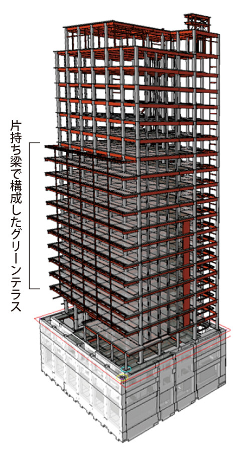 グリーンテラスは、建物から約4m張り出す片持ち構造(一端が支点に固定され、もう一端が自由に浮いている架構構造)で設計しました。