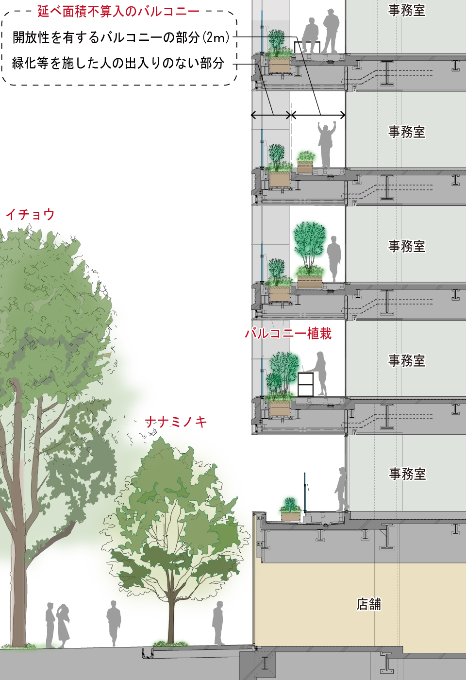 窓際から2mの範囲には鉄筋コンクリートの床を設け、人が自由に出入りできるスペースに。先端には床をつくらず植栽だけを配して装飾部として扱うことで、グリーンテラス全体を容積率不算入(建物の延べ床面積に算入しない)とし、オフィスの面積を最大限確保しました。