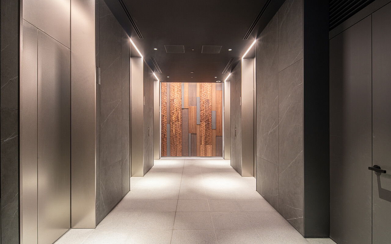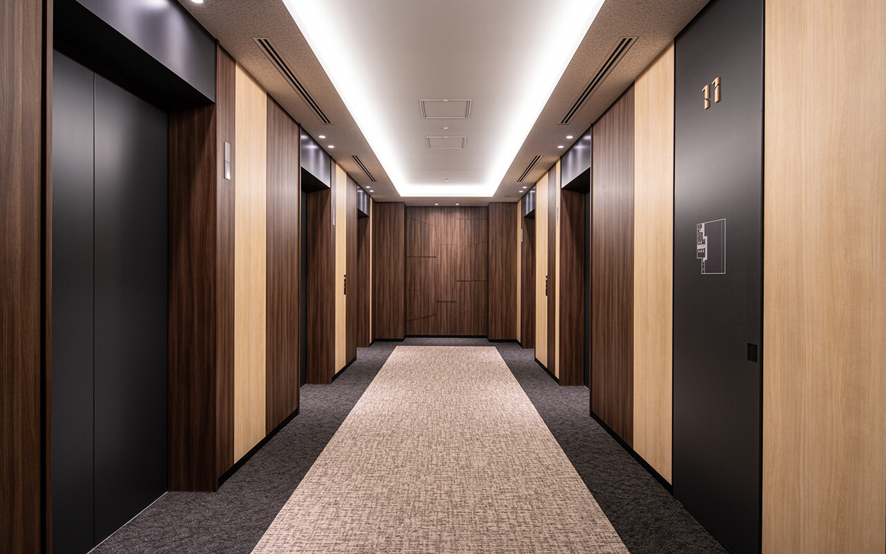 基準階エレベーターホールは木立をイメージした、木質での温かみのあるデザイン