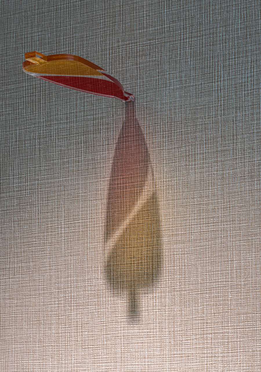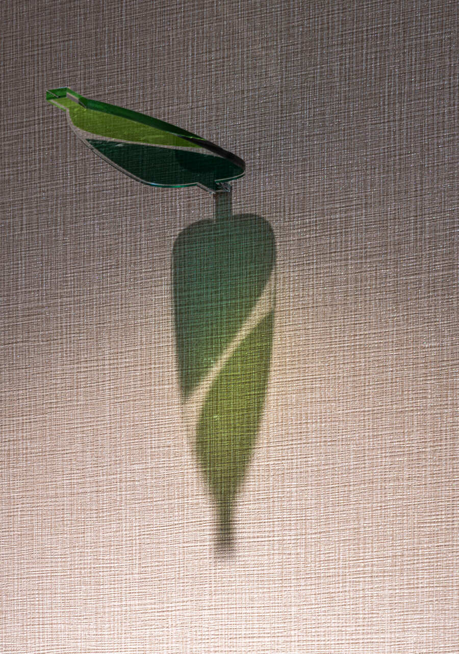 基準階トイレにはアクリル板にフィルムを貼った突き出しサインを設置。光を照射することで、壁面に落ちる葉のシルエットがサインの役割を果たす